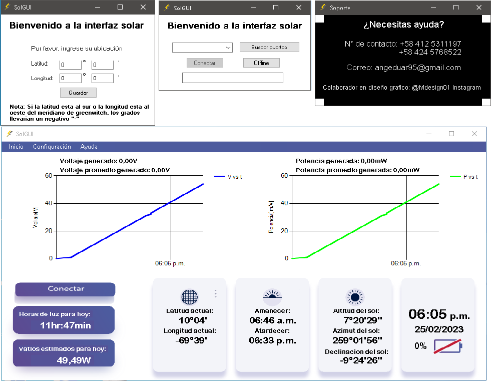 Interfaz grafica diseñada en Visual Studio C# y blend, para seguidor solar construido con Arduino, ubica matematicamente la posición del sol en tiempo real.